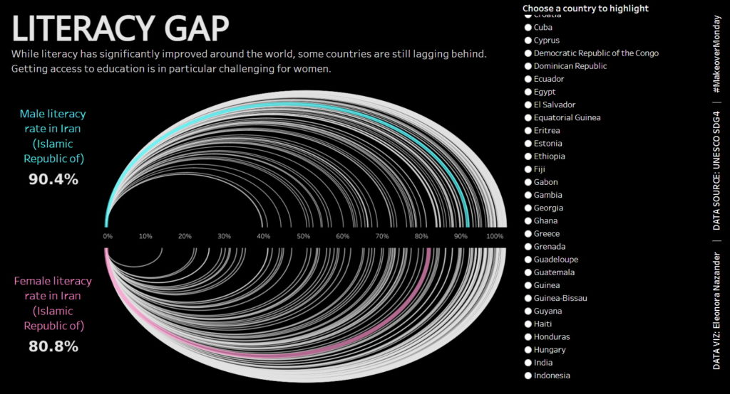 در این سایت نرخ سواد بیش از ۱۵۰ کشور و میزان سواد مردان و زنان هر کشور با استفاده از داده های یونسکو به تصویر کشیده شده است. تصویر زیر نرخ سواد مردان و زنان در ایران را نشان میدهد.