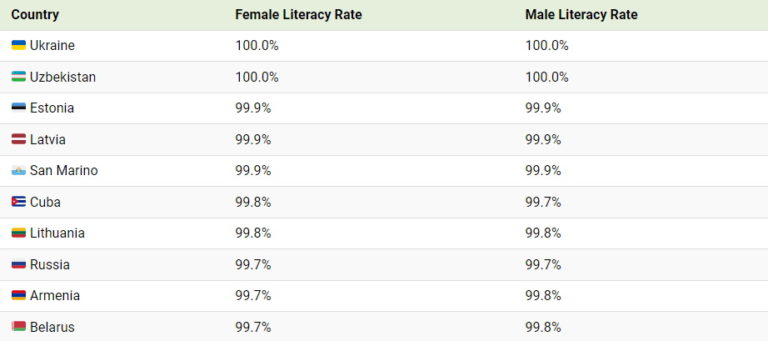 با وجود افزایش کلی نرخ سواد در جهان، برخی از کشورها نسبت به سایرین رشد بیشتری داشتهاند. فهرست زیر کشورهایی با بالاترین نرخ سواد را نشان میدهد که همگی بالای ۹۹ درصد هستند و در این میان اوکراین و ازبکستان نرخ سواد ۱۰۰ درصدی دارند.