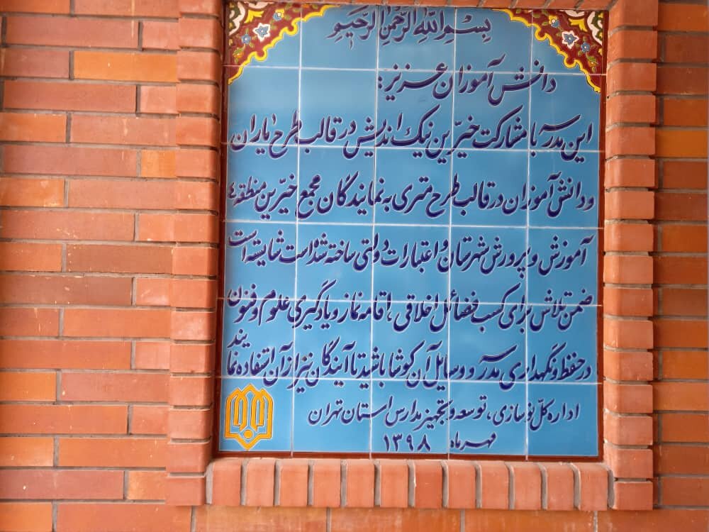 این خیر مدرسهساز میافزاید: «به پاس این اقدام خیرخواهانه اسامی خیران و دانشآموزانی که با دستان کوچک و همت بلندشان در ساخت این مدرسه مشارکت داشتند، روی کاشیهای حیاط نگاشته شده تا برای همیشه به یادگار بماند.»
