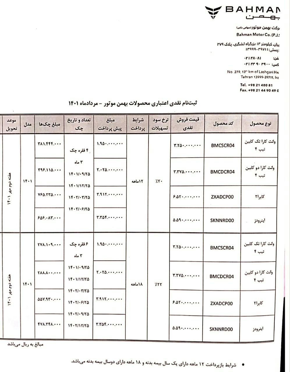 شرایط ثبت نام نقدی-اعتباری محصولات شرکت بهمن موتور با قیمت قطعی به صورت آنلاین (به تعداد محدود) از امروز یکشنبه 1401/05/23 ساعت 10 صبح تا زمان تکمیل ظرفیت به شرح جدول ذیل اعلام میگردد.