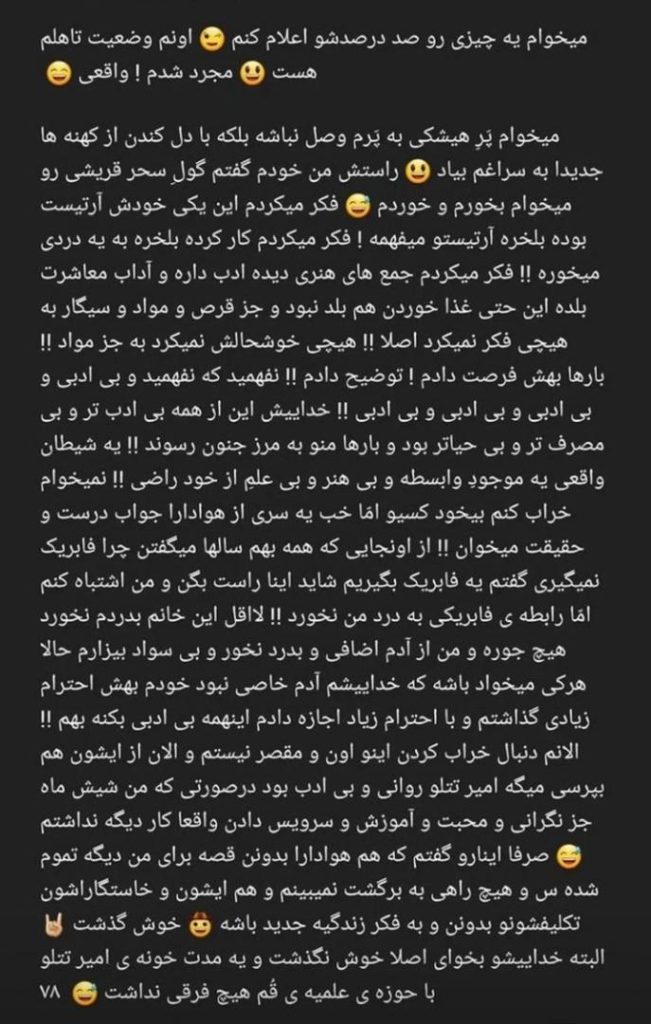 پس از بارها قهر و آشتی مجازی، به نظر می رسد این بار جدایی سحر قریشی و تتلو جدی باشد.