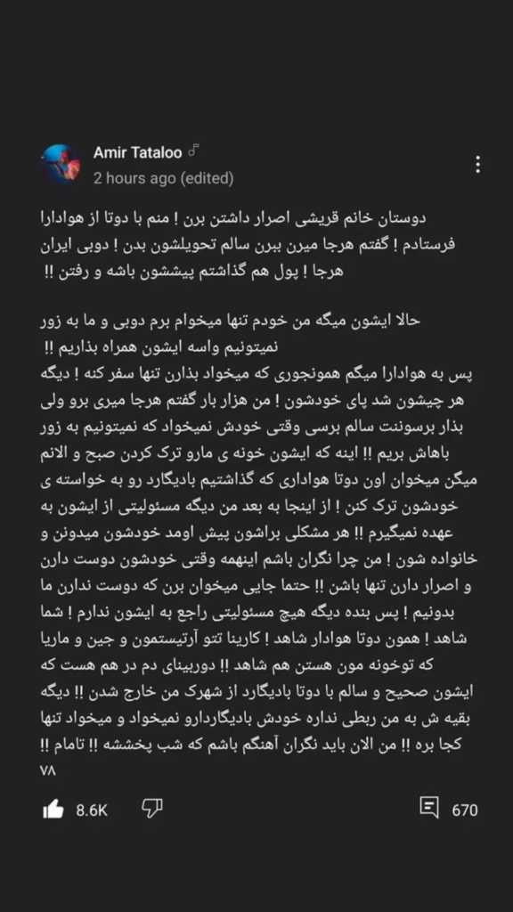 سحر قریشی اما در این مدت دیگر واکنشی به پیام های تتلو نداشت تا اینکه چند روز قبل بالاخره تصاویر مشترک خود با تتلو را از اینستاگرامش پاک کرد. او همچنین در بیوگرافی صفحه ی خود مکان فعلی اش را امارات متحده عربی اعلام کرده است.