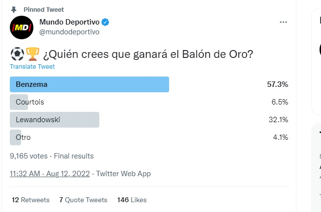 در همین رابطه نشریه «موندو دپورتیوو» اسپانیا یک نظرسنجی به راه انداخت تا نظر کاربرانش را درباره شانس اول کسب توپ طلای 2022 بپرسد.