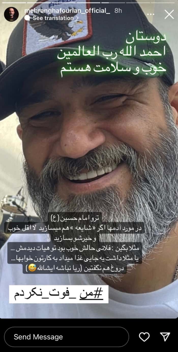 مهران غفوریان در پایان هم با استفاده از هشتگ من فوت نکردم، شایعه فوت اش را تکذیب کرد.