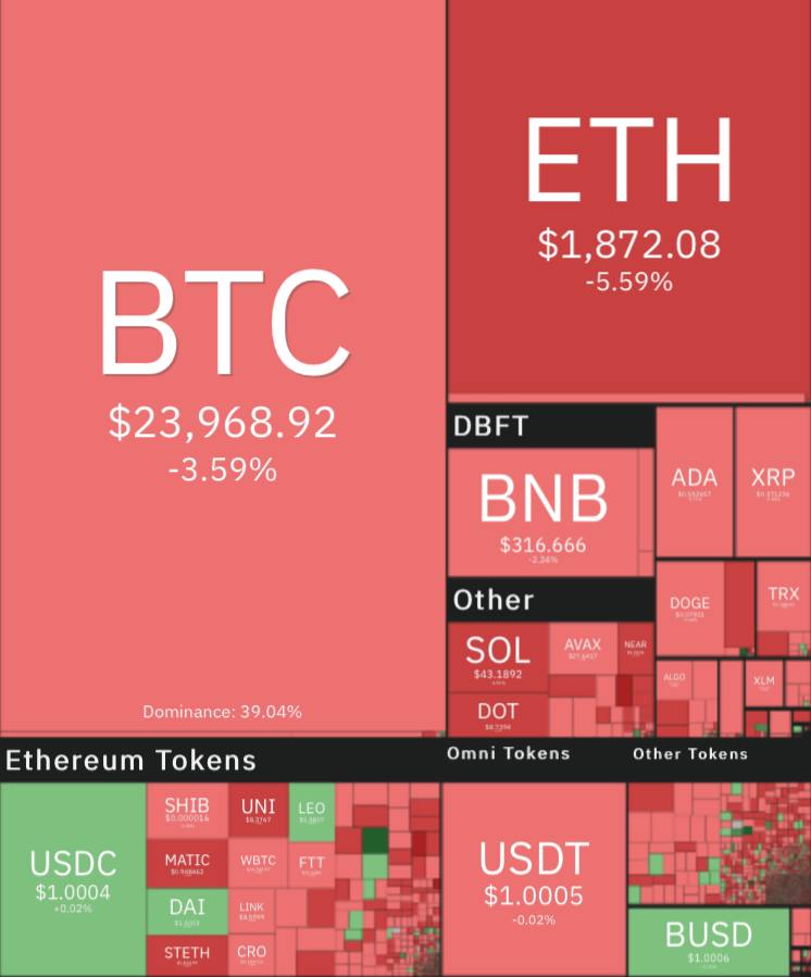 بیتکوین با افت حدود ۴ درصد به قیمت ۲۳ هزار و ۹۶۸ دلار و اتریوم با ریزش حدود ۶ درصد به قیمت هزار و ۸۷۲ دلار معامله میشوند.