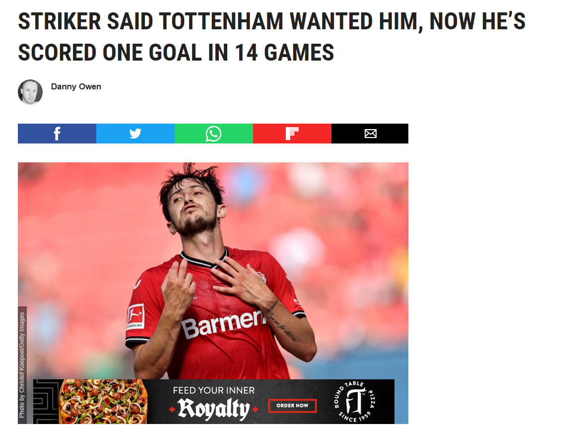 این رسانه لندنی نوشت: بازیکنی که گفته بود از تاتنهام پیشنهاد دارد، سال گذشته در پنجره زمستانی به لورکوزن رفت و حالا توانسته در 14 بازی تنها یک گل به ثمر رساند.