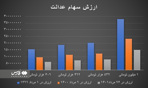 ارزش این سهام در هفته اول فروردین ماه برخلاف رشد شاخصهای عملکردی بازار سرمایه، با کاهش ارزش مواجه شد، اما در هفته دوم فروردین ماه و با رشد شاخص کل، ارزش سهام عدالت نیز رشد قابل قبولی داشته است. البته ارزش این سهام در هفته سوم فروردین ماه با افت مواجه شد. ارزش این سهام در هفته چهارم فروردین ماه با رشد ۴ درصدی که داشت افزایش قابل توجهی پیدا کرد.