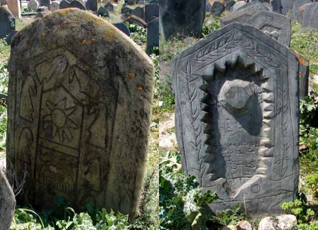سرو یکی از نقوش گیاهی روی سنگ قبرهاست که به وفور دیده میشود. تصاویری مانند شمشیر، کمان، تفنگ و باروتدان، قیچی، ماسوره و ابزار بافندگی هم در این گورستان به چشم میخورد. نقوش نمادینی مانند خورشید، آینه، شانه نیز دیده میشود.