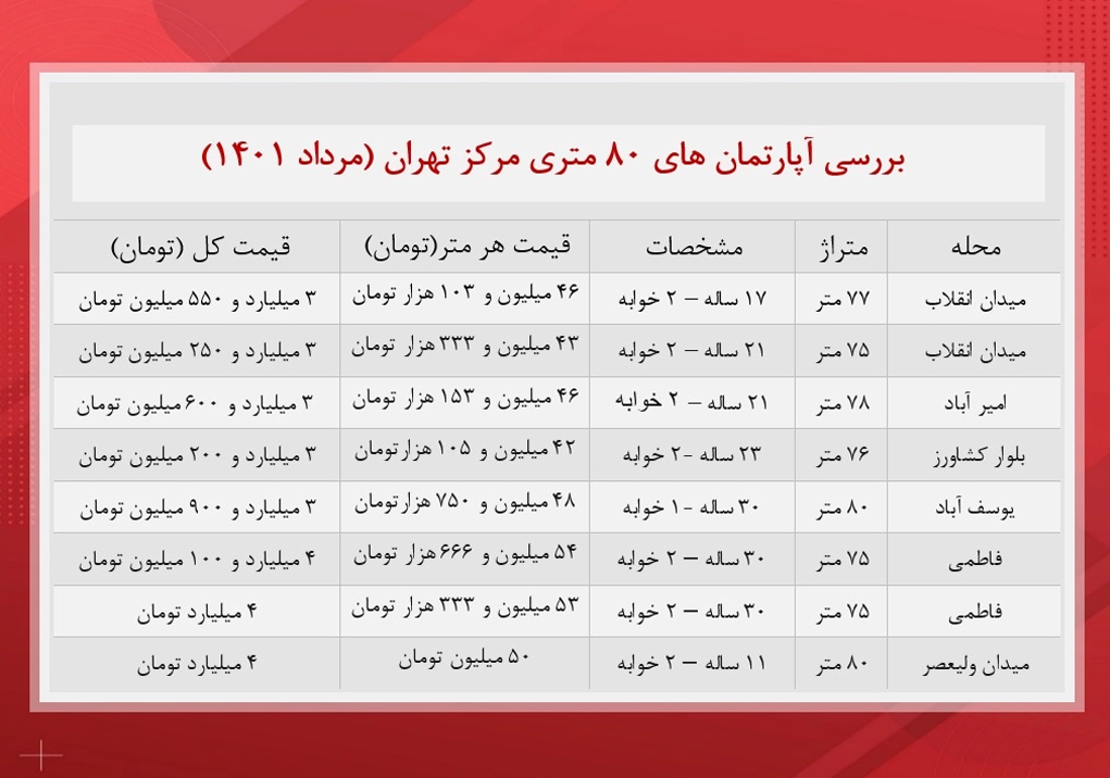در گزارش زیر به بررسی قیمت و مشخصات آپارتمانهای ۸۰ متری مرکز تهران خواهیم پرداخت.