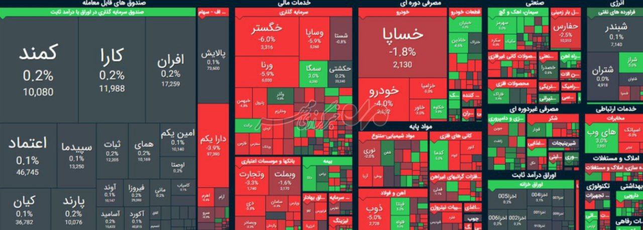 صنایع پتروشیمی خلیج فارس، معدنی و صنعتی چادرملو، معدنی و صنعتی گلگهر، ملی صنایع مس ایران و مخابرات ایران نسبت به سایر نمادها بیشترین تاثیر منفی را روی بورس گذاشتند.