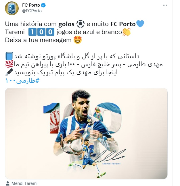 ستاره تیم ملی کشورمان صدمین بازی اش را با پیراهن پورتو انجام داد و باشگاه بزرگ پرتغالی در اقدامی خلاقانه به مناسب این رکورد ستاره ایرانی اش در توئیتر به زبان فارسی، نوشت: داستانی که پر از گل و باشگاه پورتو نوشته شد، مهدی طارمی - پسر خلیج فارس - ۱۰۰ بازی با پیراهن تیم ما، اینجا برای مهدی یک پیام تبریک بنویسید.