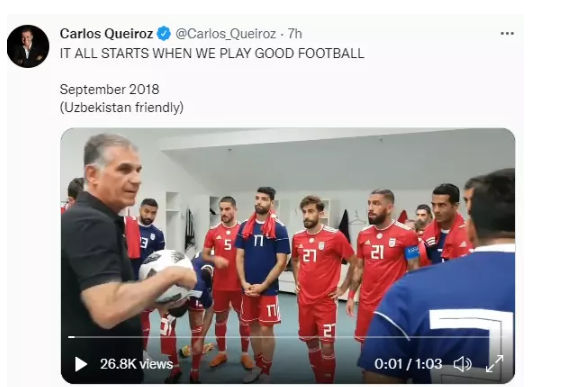 کی روش در پیام خود نوشته است: «همه چیز از فوتبال خوب شروع میشود.» این فیلم مربوط به بازی دوستانه با ازبکستان در سال ۲۰۱۸ است و مشخصاً علاقه این مربی پرتغالی برای بازگشت به ایران را نشان میدهد.