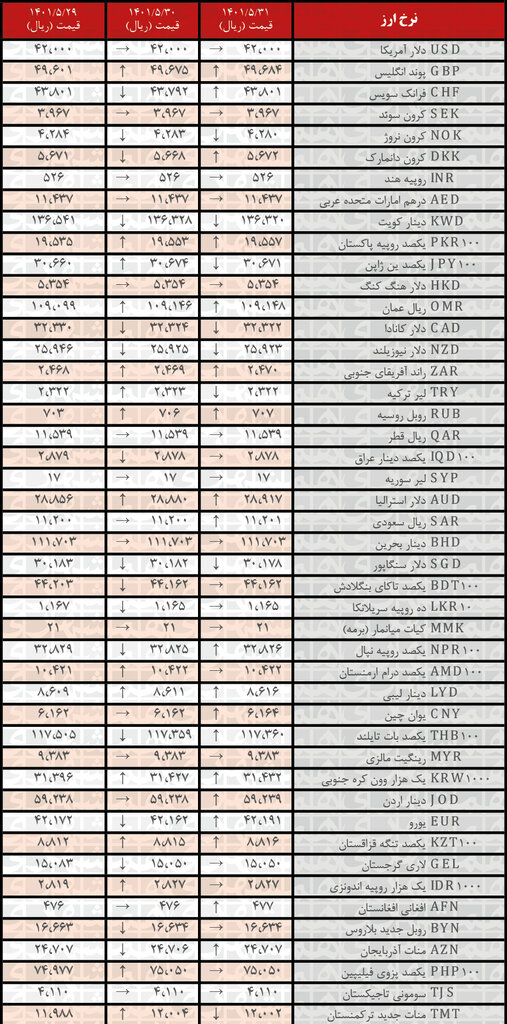 بانک مرکزی امروز نرخ هر دلار را ۴۲ هزار ریال، پوند را ۴۹ هزار و ۶۸۴ و یورو را ۴۲ هزار و ۱۹۱ ریال اعلام کرد.