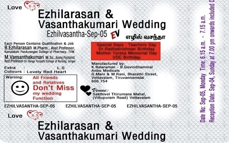 این تصویر که اکنون در فضای مجازی دست به دست می‌چرخد، متعلق به یک داروساز است! فردی هم که عکس این کارت عروسی را منتشر کرده، زیر آن نوشته است: «این متعلق به یک داروساز است! مردم چقدر خلاق شده‌اند.»