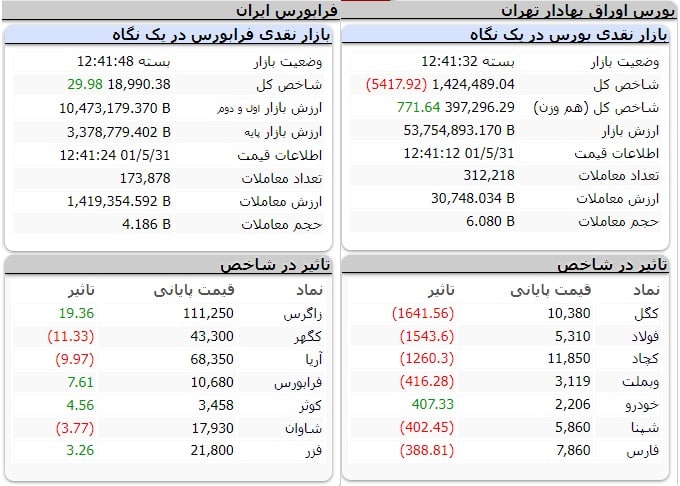 به گزارش سایت طلا،شاخص کل بورس امروز با ۵۴۱۶ واحد کاهش در رقم یک میلیون و ۴۲۴ هزار واحد ایستاد. این در حالی است که شاخص کل با معیار هم‌وزن ۷۷۱ واحد افزایش یافت و در رقم ۳۹۷ هزار و ۲۹۶ واحد قرار گرفت. در این بازار ۳۱۳ هزار معامله به ارزش ۳۲ هزار و ۵۵۳ میلیارد ریال انجام شد.