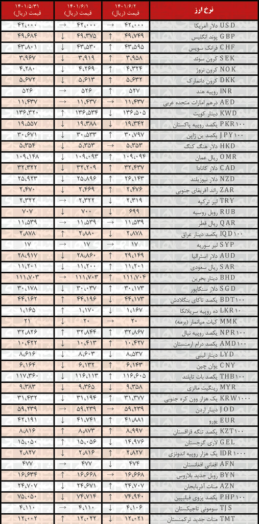 بانک مرکزی امروز نرخ هر دلار را ۴۲ هزار ریال، پوند را ۴۹ هزار و ۷۴۹ و یورو را ۴۱ هزار و ۸۸۱ ریال اعلام کرد.