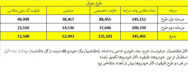 جمع تعداد متقاضیان واجد شرایط (طرح جوانی جمعیت) در مراحل اول و دوم قرعهکشی خودرو از طریق سامانه یکپارچه تخصیص خودرو ۳۴۵ هزار و ۴۹۱ نفر بود که جمع ظرفیت تخصیصی خودرو از طریق سامانه یکپارچه تخصیص خودرو به این افراد ۱۲۵ هزار و ۵۰۱ دستگاه خودرو بوده است.