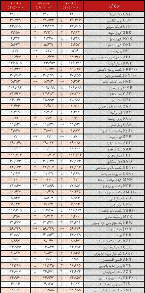 بانک مرکزی امروز نرخ هر دلار را ۴۲ هزار ریال، پوند را ۴۹ هزار و ۴۹۶ و یورو را ۴۲ هزار و ۳۸ ریال اعلام کرد.