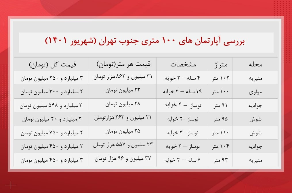 قیمت آپارتمان های ۱۰۰ متری‌ در جنوب تهران + جدول