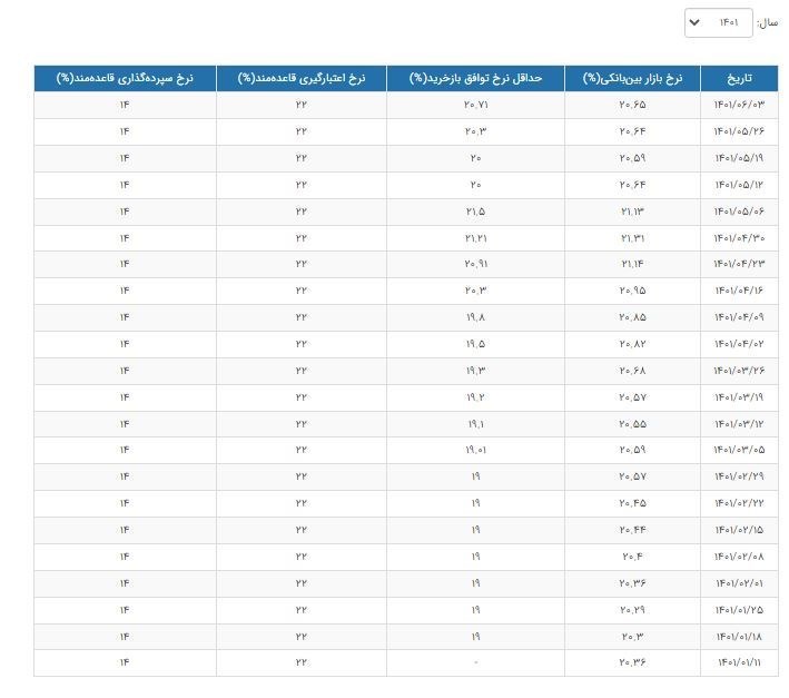 جدول نرخ سود منتشر شده از سوی بانک مرکزی نشان می دهد، روند رو به رشد نرخ سود بازار بین بانکی از فروردین ماه امسال آغاز شد و از 20.36 درصد در یازدهم فروردین ماه امسال به 21.31 درصد در 30 تیرماه 1401 رسید.