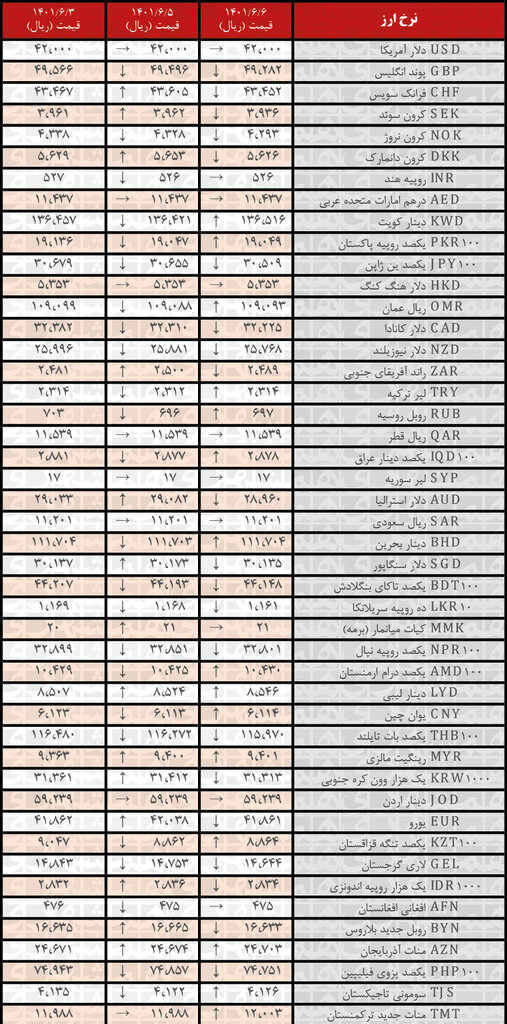بانک مرکزی امروز، یکشنبه (۶ شهریور)، نرخ رسمی ۴۶ ارز را اعلام کرد که بر اساس آن نرخ ۱۵ ارز افزایش و نرخ ۲۱ ارز کاهش یافت. نرخ باقی ارزها ثابت ماند.