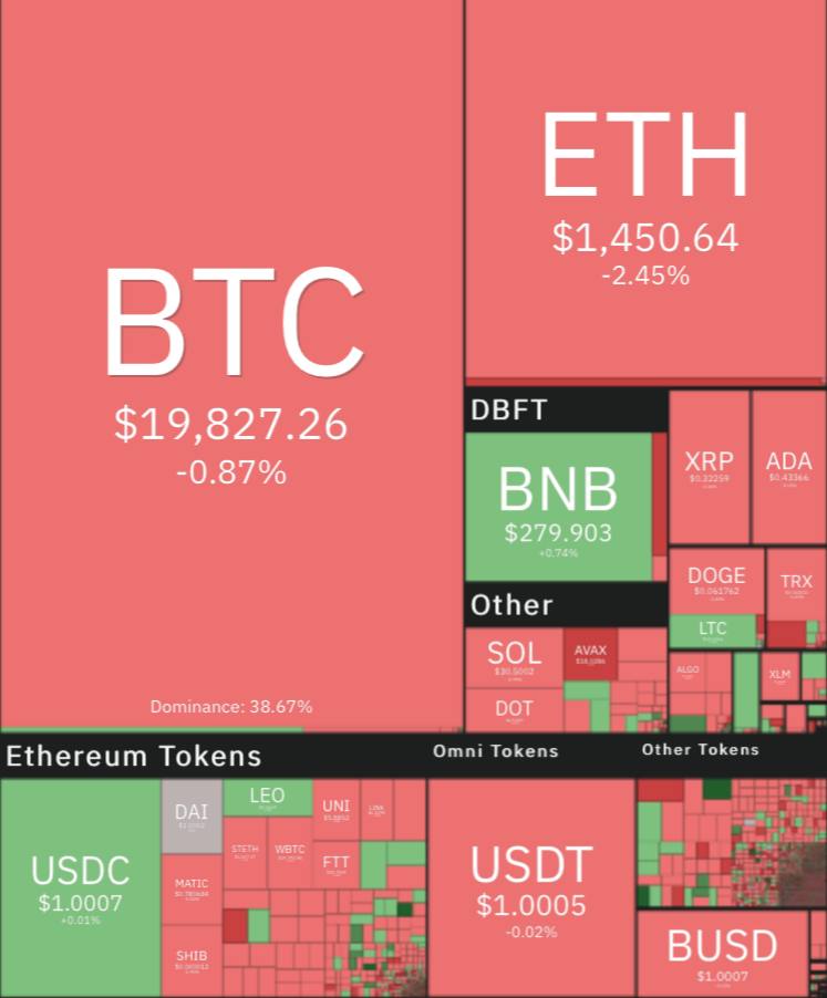 بیتکوین با افت حدود ۱ درصد به قیمت ۱۹ هزار و ۸۲۷ دلار و اتریوم با کاهش بیش از ۲ درصد به قیمت هزار و ۴۵۰ دلار معامله میشوند.