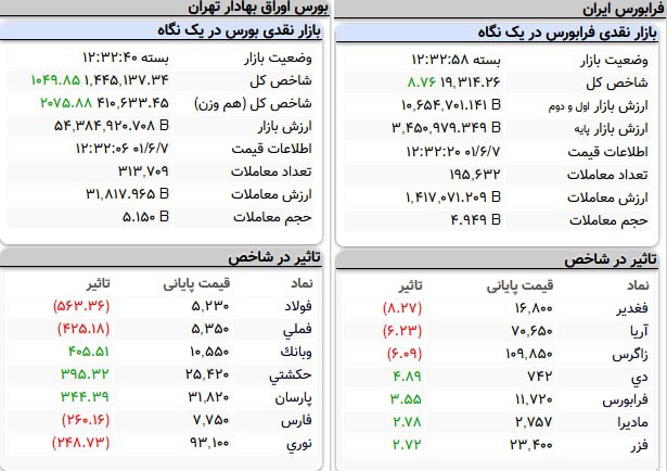 در این بازار هم امروز بیشترین اثر مثبت بر شاخص فرابورس به نام نمادهای معاملاتی بانک دی، فرابورس ایران و صنایع مادایران شد و در مقابل شرکت‌های فولاد غدیر ایرانیان، پلیمر آریا ساسول و پتروشیمی زاگرس بیشترین اثر منفی را بر این شاخص به نام خود ثبت کردند.