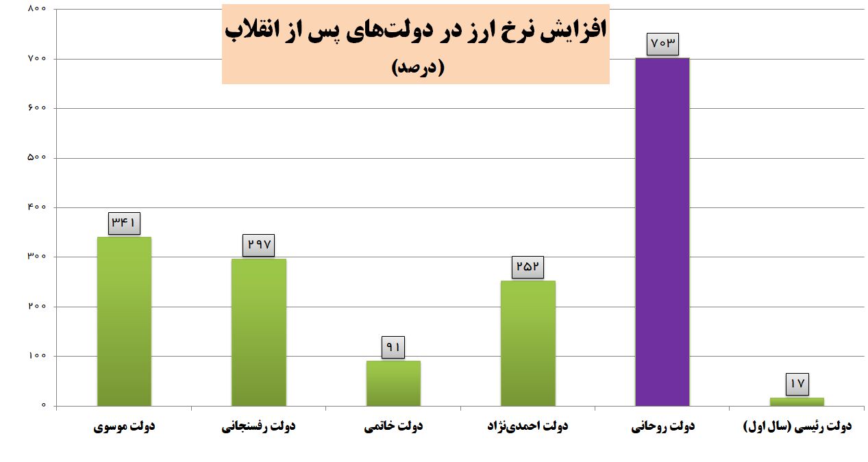 در بین دولتهای پس از انقلاب، بعد از دولت گذشته که رتبه اول را از لحاظ گرانی ارز داشته، دولت موسوی با ۳۴۱ درصد و دولت رفسنجانی با ۲۹۷ درصد در رتبههای دوم و سوم قرار دارند.