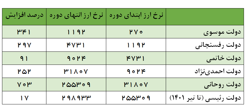 دولت دهم در مرداد ۱۳۹۲ نرخ ارز را با قیمت ۳۱۸۰ تومان به دولت روحانی تحویل داد اما این دولت با افزایش بیسابقه ۷۰۳ درصدی، نرخ ارز را با قیمت ۲۵۵۳۰ تومان در مرداد ۱۴۰۰ به دولت آیتالله رئیسی تحویل داد.