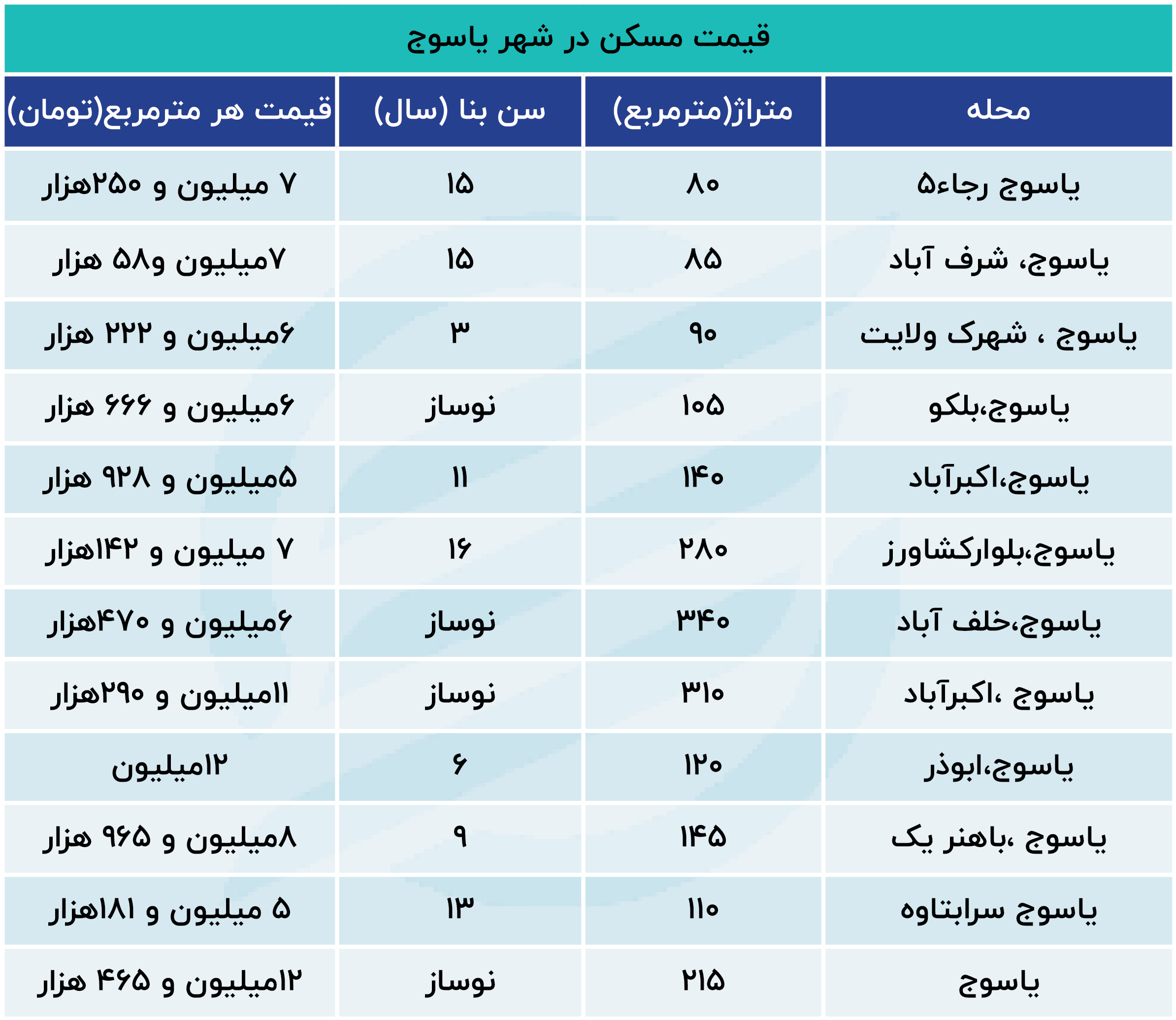 براساس این گزارش طبق برخی منابع معتبر قیمت زیر 2 میلیون تومان در شهر یاسوج که از آن به عنوان ارزانترین شهر یاسوج یاد شده است نمی تواند معتبر باشد زیرا قیمت مسکن حتی در روستاهای دور دست مناطق حاشیه ای یاسوج بالای یک میلیون و 700 هزار تومان است.