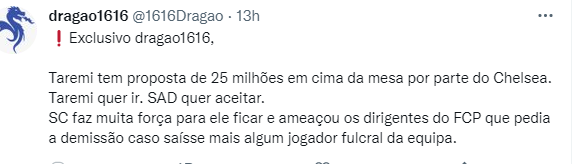 در میانه همه این اتفاقات، روز گذشته یک صفحه توییتری که اخبار باشگاه پورتو را پوشش میدهد، در خبری اختصاصی مدعی شد باشگاه چلسی پیشنهادی ۲۵ میلیون یورویی برای جذب طارمی به پورتو پیشنهاد داده است.