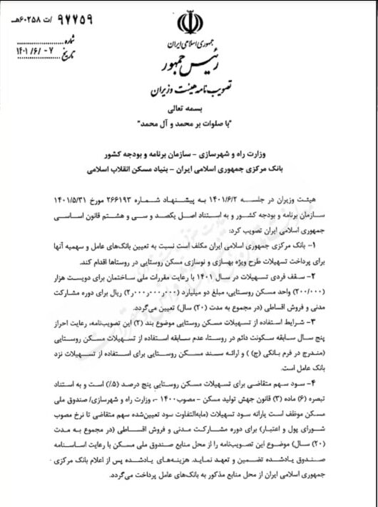 مصوبه هیئت دولت در خصوص افزایش سقف تسهیلات ساخت مسکن روستایی به ۲۰۰ میلیون تومان با نرخ سود ۵ درصد ابلاغ شد.