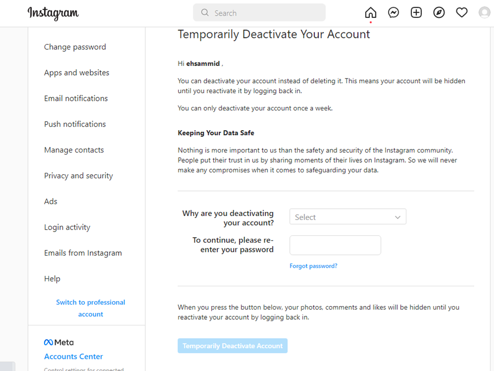 مراحل دیلیت اکانت اینستاگرام بهصورت موقتی: