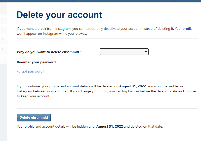 حتماً قبل از تکمیل فرایند دیلیت اکانت به نوشته زیر دکمه delete account دقت کنید، زیر این دکمه تاریخ دقیق پاک شدن اکانت شما مشخص شده است، درصورتیکه زودتر از این تاریخ دوباره به اکانت خود لاگین کنید فرایند حذف دائم اکانت اینستاگرام شما متوقف خواهد شد.