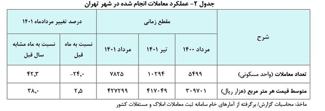 در مرداد ماه امسال متوسط قیمت یک متر مربع مسکن در شهر تهران، ۴۲ میلیون و ۷۳۰ هزار تومان بوده که نسبت به ماه قبل و مدت مشابه سال قبل به ترتیب ۲.۵ و ۳۸ درصد افزایش یافته است.
