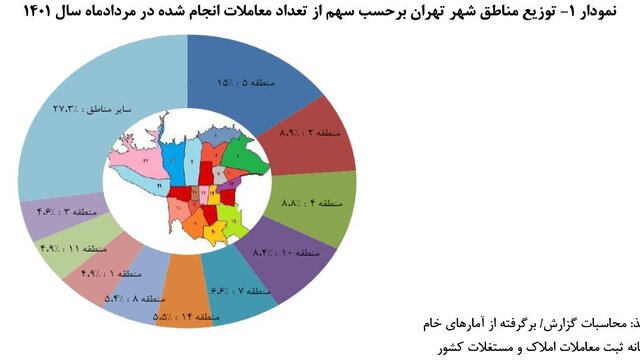 همچنین، توزیع معاملات انجام شده مسکن بر اساس مناطق شهری در تهران حاکی از آن است که منطقه ۵ با ۱۵ درصد از کل معاملات، بیشترین سهم معاملات شهر تهران را به خود اختصاص داده است.