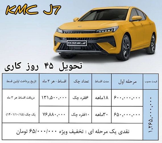 به گزارش سایت طلا، شرایط طرح فروش قسطی خودرو جدید KMC J7 ویژه شهریور 1401 اعلام شد.
