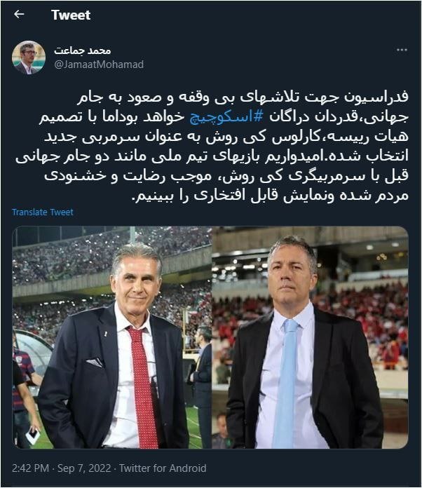 محمد جماعت مدیررسانه تیم ملی در توییتر خود نوشته است: فدراسیون جهت تلاشهای بی وقفه و صعود به جام جهانی، قدردان دراگان اسکوچیچ خواهد بود اما با تصمیم هیئت رییسه، کارلوس کی روش به عنوان سرمربی جدید انتخاب شده. امیدواریم بازیهای تیم ملی مانند دو جام جهانی قبل با سرمربیگری کی روش، موجب رضایت و خشنودی مردم شده و نمایش قابل افتخاری را ببینیم.