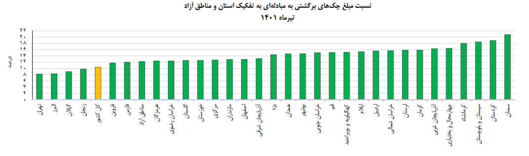 در تیر 1401 به طور کلی 6 میلیون 321 هزار فقره چک صادره شده که از این میزان 586 هزار و 400 تای آن معادل با 9.3 درصد برگشت خورده است. به طور کلی از کل چک های مبادله شده 30 درصد آن درتهران، 10 درصد اصفهان و 60 درصد باقیمانده در سایر استان های کشور ثبت شده است.