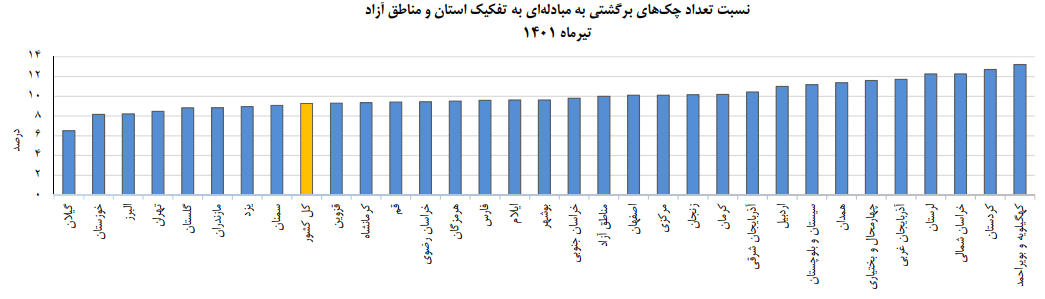 در مقابل اما کهگلویه و بویر احمد با 13.2 درصد رکورد دار بیشترین سهم چک برگشتی در تیرماه بوده است.
