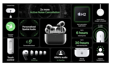 تراشه جدید H2 در یک قاب سبک و بسیار کمحجم ساخته شده است که تجربه آکوستیک استثنایی را ارائه میدهد و تا دوبرابر بیشتر از نسل قبلی AirPods Pro نویز را کاهش میدهد.