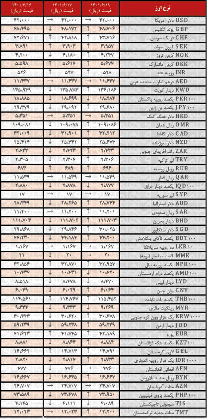 بانک مرکزی امروز نرخ هر دلار را ۴۲ هزار ریال، پوند را ۴۸ هزار و ۷۰۶ و یورو را ۴۲ هزار و ۱۸۹ ریال اعلام کرد.
