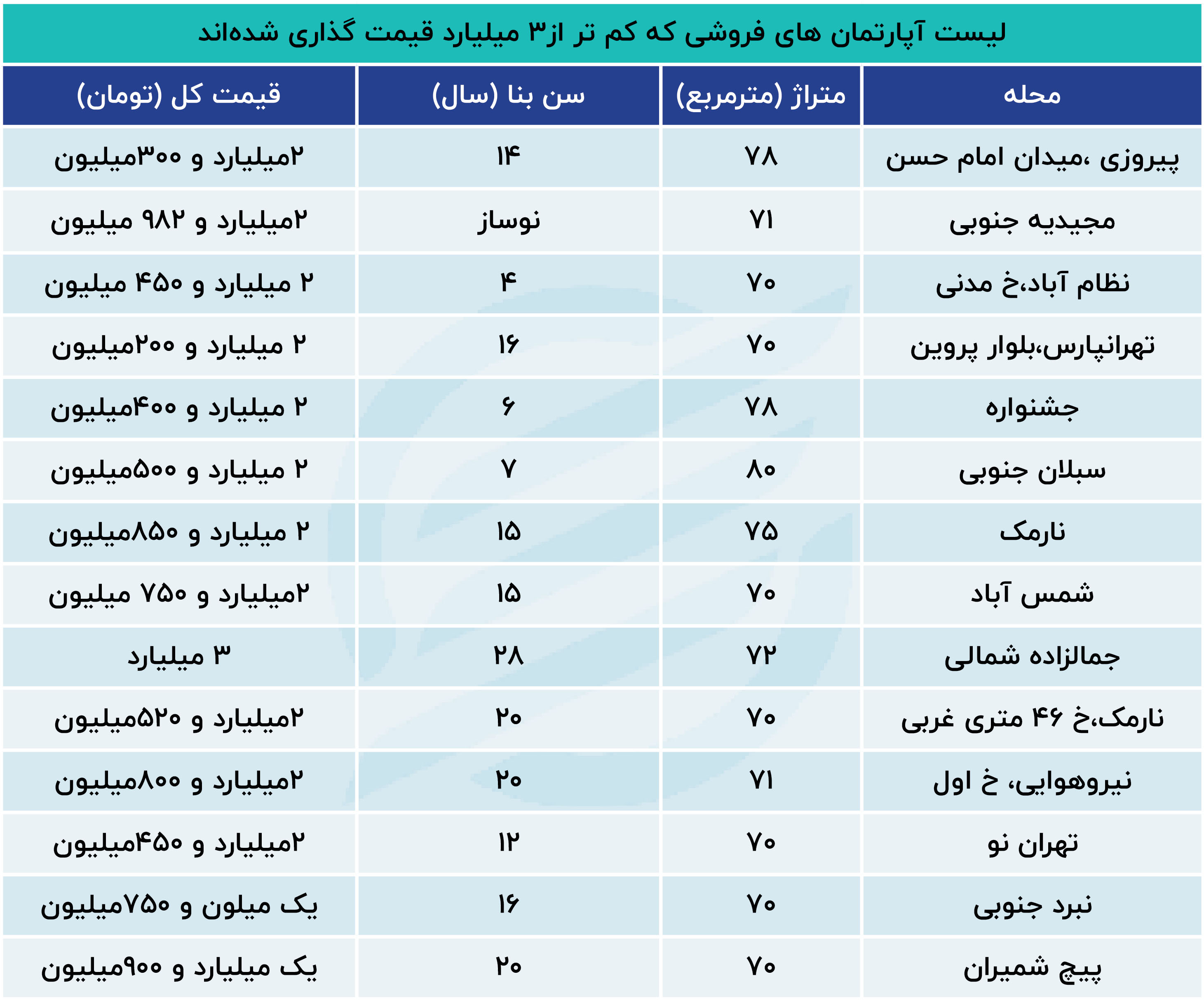 در لیست آپارتمانهایی که برای فروش گذاشته شده، بیشترین معاملات مربوط به آپارتمانهایی است که زیر 3 میلیارد و 100 میلیون قیمت گذاری شدهاند، اما این آپارتمانها را در کدام منطقه تهران میتوان پیدا کرد؟