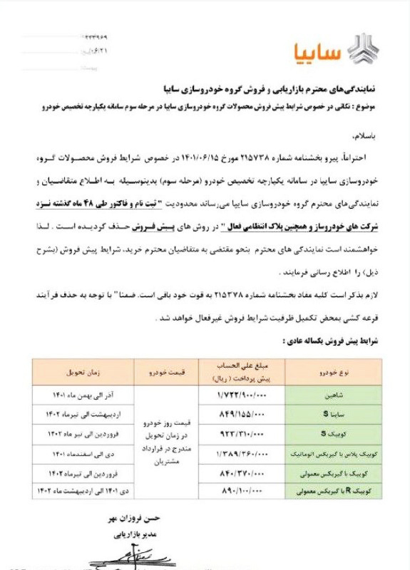 بخشنامه پیش فروش سایپا ویژه شهریور ماه ۱۴۰۱ بدون محدودیت به شرح زیر اعلام گردید.