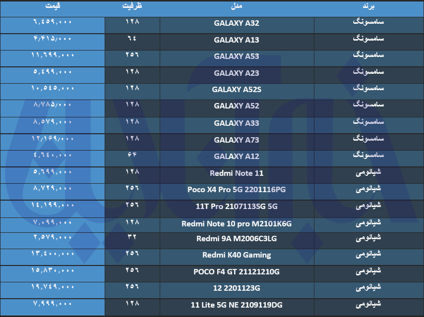 جدیدترین قیمت انواع گوشی سامسونگ و شیائومی + جدول