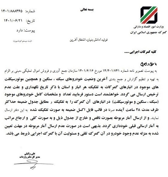 به دنبال این نامه که در تاریخ 16 شهریور ماه ارسال شده بود، گمرک ایران به تمامی گمرکات اجرایی اعلام کرده است که آخرین وضعیت خودروهای سبک، سنگین و همچنین موتورسیکلت های موجود در انبارهای گمرکات به تفکیک هر انبار و استان با ذکر تاریخ نگهداری و علت عدم ترخیص آن را اعلام کنند.