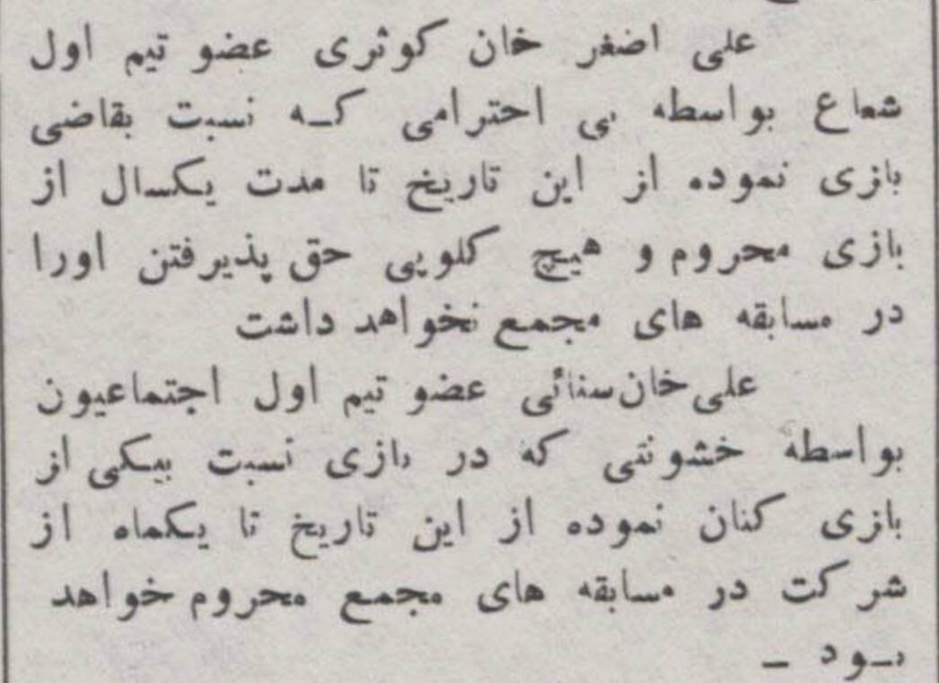 اولین بازیکن فوتبال محروم تاریخ فوتبال ایران علی‌اصغر خان کوثری بود که به علت بی احترامی به داور یکسال حق حضور در مسابقات را نداشت.