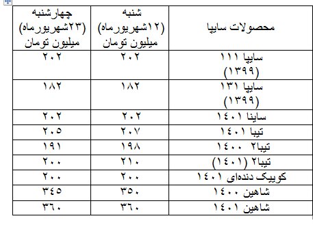 در محصولات گروه سایپا نیز پرایدها، کوییک و شاهین تولید ۱۴۰۱ تغییر قیمتی نداشتهاند اما تیباها و شاهین تولیدی ۱۴۰۰ دو تا ۱۰ میلیون تومان ارزانتر شدهاند.