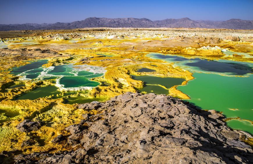 فرورفتگی داناکیل، واقع در اتیوپی، منظره ای زرد-نارنجی است که از نمک سوزان، سنگ های آتشفشانی و اسید سولفوریک تشکیل شده است. این منطقه به دلیل خواص هیدروترمال بالای این منطقه، سمی نیست، بلکه برای زندگی نیز نامناسب است. این مکان فرورفتگی شبیه به مریخ دارد که توسط آتشفشان های متعددی در داخل فرورفتگی پوشیده شده است.