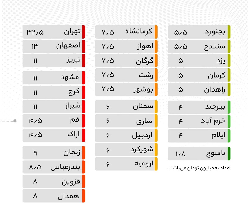 تهران با متوسط قیمت بیش از ۳۲ میلیون به عنوان بیشترین و یاسوج با متوسط قیمت یک میلیون و ۸۰۰ هزار تومان به عنوان کمترین متوسط قیمت مسکن در کشور شناخته می شوند.